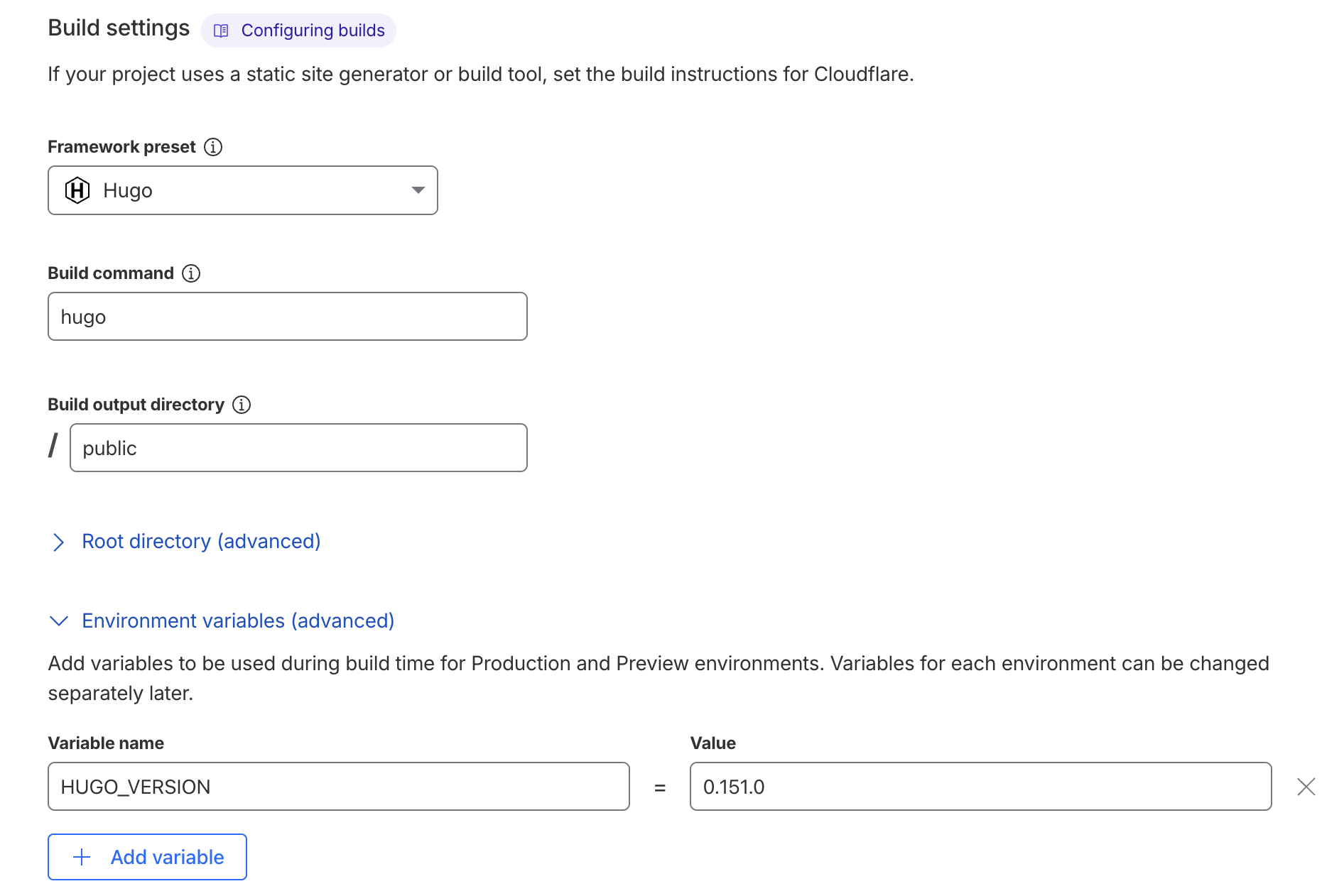 folder should be gitignored since it’s generated. For proper linking and deployment, setting a specific Hugo version by adding it as an env var is highly recommended. - Cloudflare automatically builds and deploys on every push